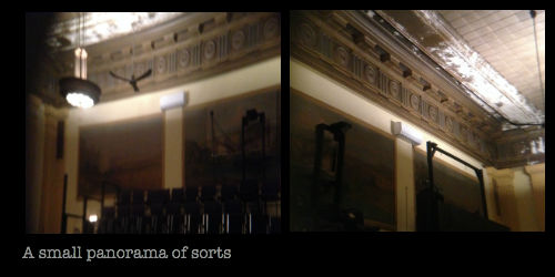 A few more Mason’s Hall pictures. I really wish I had thought to take a (real) panorama shot. This is of the back (North) wall and you’d walk into the hall from that left corner.